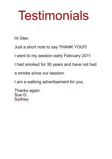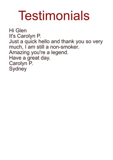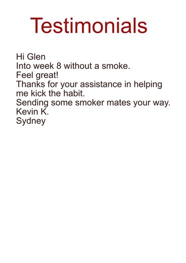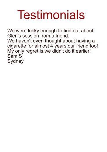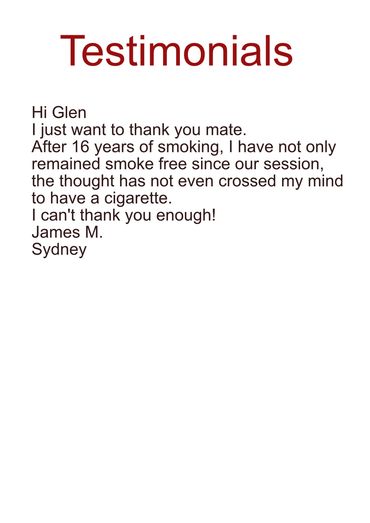 The vast majority of Glen's clients quit smoking in just one 90 minute session. There's No pills, No patches, No gums and No ongoing expensive hypnotherapy visits.